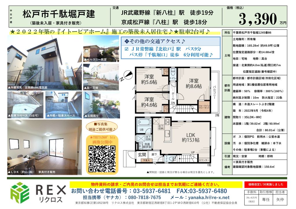 《松戸市千駄堀戸建(築後未入居の家具付き販売)》 【販売価格:3,390万円】